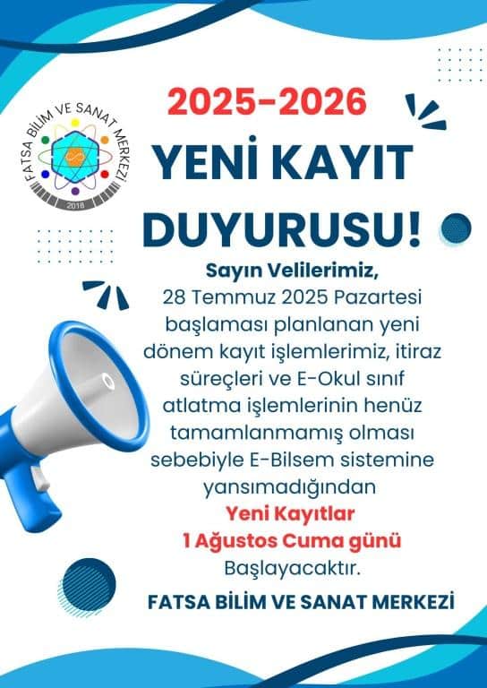 BİLSEM'e ilk defa kayıt hakkı kazanan öğrencilerimizin yeni kayıt işlemleri 1 AĞUSTOS - 29 AĞUSTOS tarihleri ve 10.00-12.00/13.00-16.00 saatleri arasında kurumumuzda yüz yüze gerçekleştirilecektir.